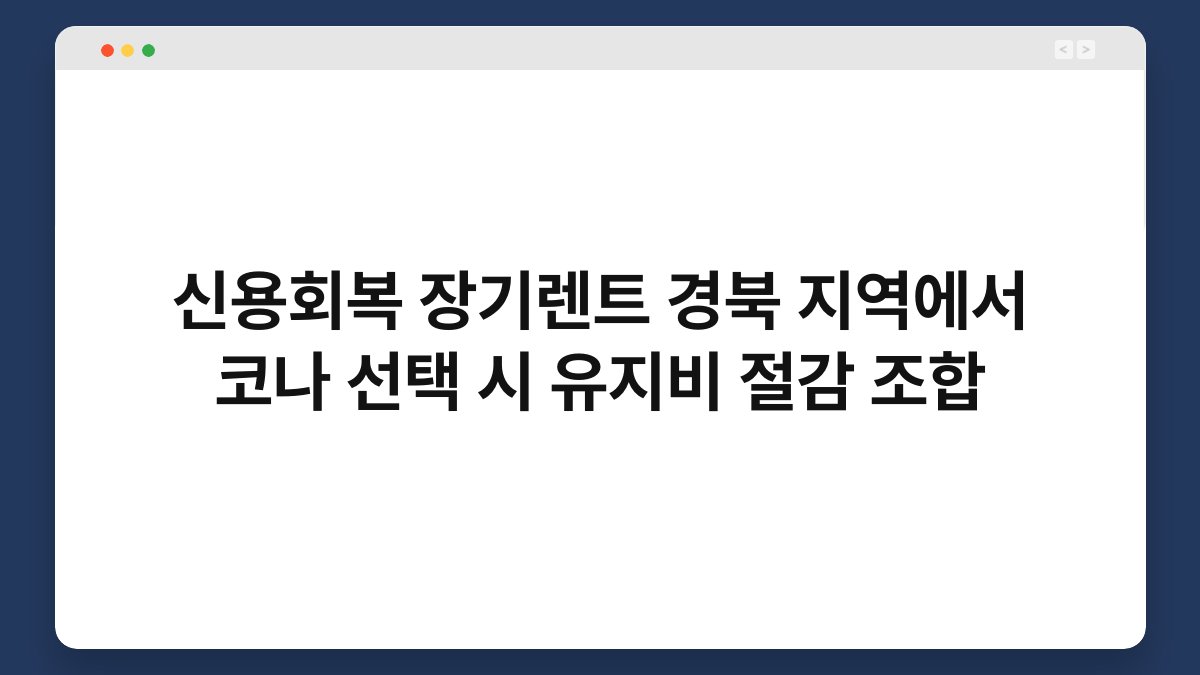 장기렌트는 차량 소유의 부담을 덜어줍니다. 월 렌트료로 차량을 이용할 수 있으며, 유지비와 보험료도 포함된 경우가 많습니다. 따라서 신용 회복 중에도 부담 없이 차량을 이용할 수 있습니다. 경북 지역에서도 다양한 선택지가 마련되어 있죠.