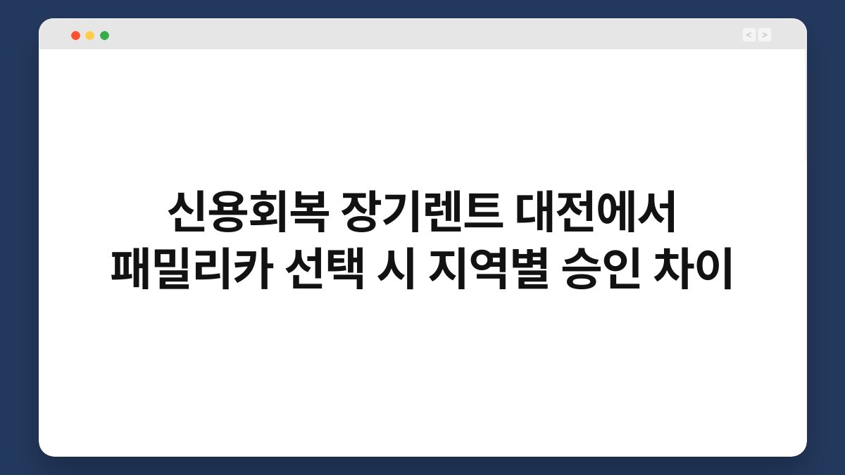 신용회복과 장기렌트, 특히 대전에서 패밀리카를 선택할 때 고려해야 할 중요한 요소들이 있습니다. 지역별로 승인 차이가 존재하는데, 이는 신용 등급과 렌트 조건에 따라 달라질 수 있습니다. 대전 지역에서 패밀리카를 선택할 때, 신용회복의 기회를 활용하는 방법과 황제오토플랜의 도움을 통해 보다 유리한 조건을 찾는 방법을 소개하겠습니다. 이 글을 통해 장기렌트와 관련된 다양한 정보와 팁을 얻으실 수 있습니다.