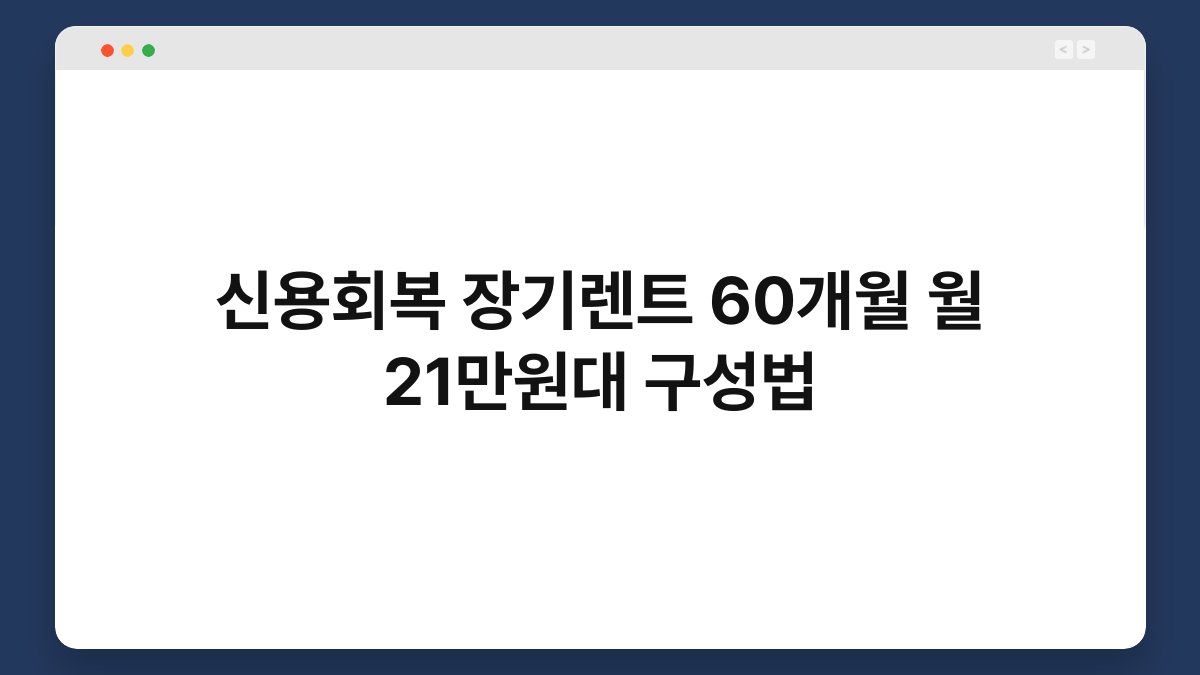 신용회복은 많은 분들이 직면하는 문제입니다. 신용이 낮아지면 대출이나 할부 구매가 어려워지죠. 이럴 때 장기렌트는 차량을 소유하지 않고도 필요한 이동 수단을 확보할 수 있는 방법입니다. 특히, 월 21만원대의 부담 없는 가격으로 60개월 동안 차량을 이용할 수 있다는 점에서 많은 이들의 관심을 받고 있습니다.