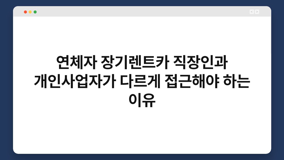 운전할 차량이 필요하지만, 신용 등급이 낮아 고민이신가요? 장기렌트카는 이런 상황에서 유용한 대안이 될 수 있습니다. 특히 직장인과 개인사업자는 연체자 장기렌트카를 접근하는 방법에서 차이를 보이는데요. 이 글에서는 그 이유와 함께 황제오토플랜의 장기렌트 서비스를 소개하겠습니다. 신용 등급에 대한 고민을 덜고, 여러분에게 맞는 최적의 차량을 찾는 방법을 알아보세요.