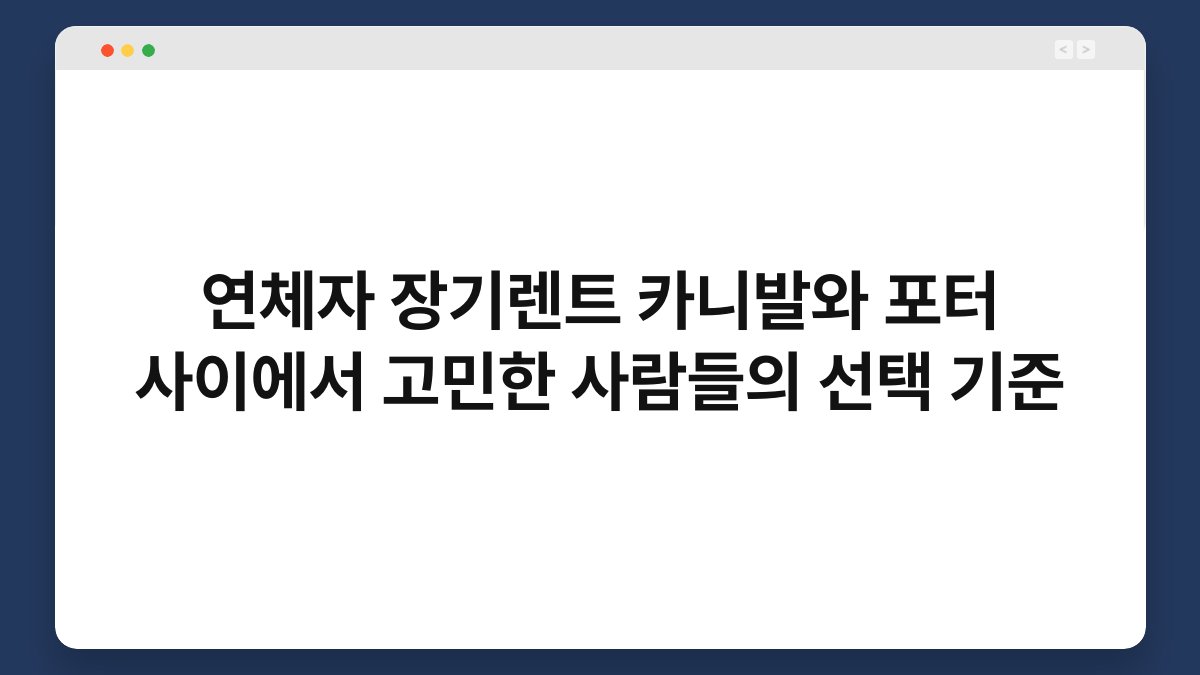 운전 중에 어떤 차량을 선택할지 고민해본 적 있으신가요? 특히 카니발과 포터처럼 인기 있는 차량 사이에서 선택의 갈림길에 서게 된다면, 여러 가지 기준을 고려하게 됩니다. 연체자로서 장기렌트를 선택할 때는 더더욱 신중해야 합니다. 황제오토플랜은 이러한 고민을 덜어주기 위해 다양한 정보를 제공하고 있습니다. 이 글에서는 연체자들이 카니발과 포터, 두 차량 사이에서 고민할 때 어떤 기준으로 선택하는지 알아보겠습니다.