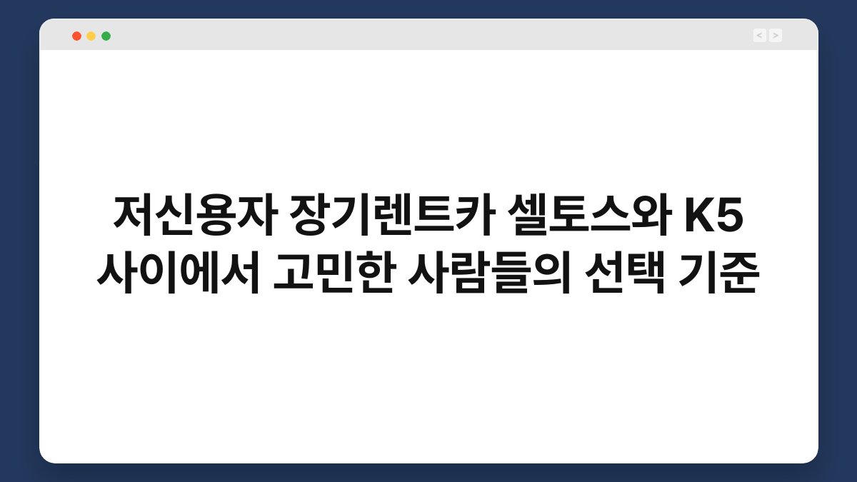 차량 선택은 많은 분들에게 고민거리가 됩니다. 저신용자라면 더욱 그렇죠. 특히 셀토스와 K5 중에서 선택해야 할 때, 어떤 기준으로 결정을 내려야 할지 막막할 수 있습니다. 이 글에서는 저신용자 장기렌트카를 고려하는 분들을 위해 두 모델의 장단점을 비교하고, 황제오토플랜을 통해 어떻게 도움을 받을 수 있는지 알아보겠습니다. 선택의 기준을 명확히 하고, 보다 현명한 결정을 내릴 수 있도록 안내해 드릴게요.