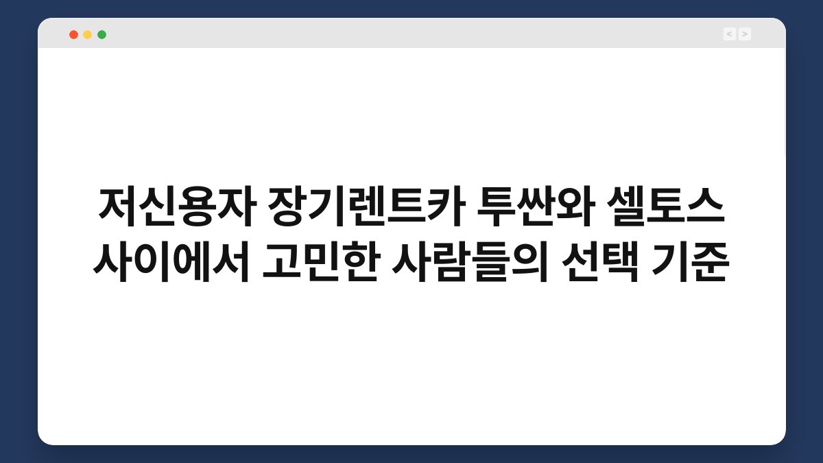 저신용자로서 차량을 장기렌트할 때, 어떤 선택 기준을 가지고 고민하셨나요? 특히 투싼과 셀토스 같은 인기 모델 사이에서 결정을 내리는 것은 쉽지 않은 일입니다. 이 글에서는 저신용자들이 장기렌트카를 선택할 때 고려해야 할 다양한 요소를 살펴보며, 황제오토플랜을 통해 어떻게 최적의 선택을 할 수 있는지 안내해드리겠습니다. 신용 등급과 렌트 비용, 차량의 특성까지, 모든 정보를 종합적으로 제공하니 끝까지 함께 해주세요.