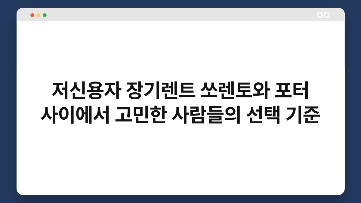 차량 구매를 고민할 때, 저신용자에게는 선택지가 제한적일 수 있습니다. 특히 쏘렌토와 포터 같은 인기 모델 사이에서 고민하는 이들이 많습니다. 이 글에서는 저신용자 장기렌트를 통해 두 차량을 비교하고, 선택 기준을 정리해 보겠습니다. 황제오토플랜을 통해 저신용자도 원하는 차량을 쉽게 이용할 수 있는 방법을 안내드릴게요.