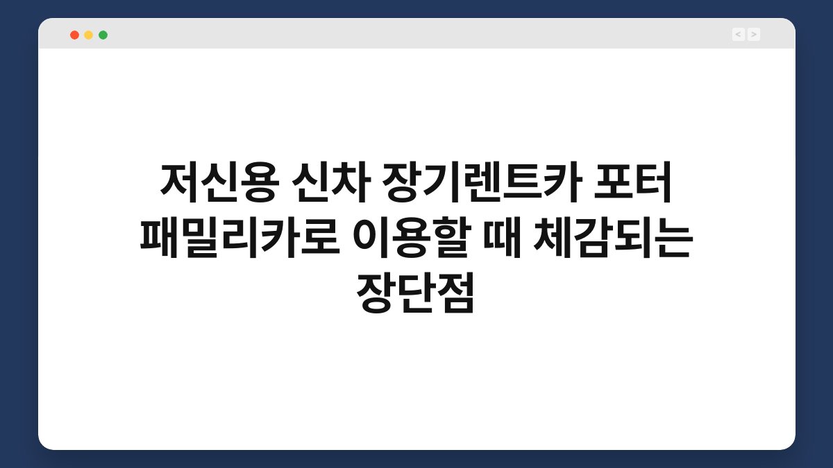 신차를 장기렌트로 이용하고 싶은데 저신용으로 고민하고 계신가요? 많은 분들이 신차를 구매하는 대신 장기렌트를 선택하는 이유는 다양한 이점 때문입니다. 특히 포터와 같은 패밀리카로 활용할 경우, 가족의 이동 편의성을 높일 수 있습니다. 하지만 저신용자에게는 장기렌트가 어떤 장단점을 가질까요? 황제오토플랜과 함께 이 문제를 해결해보겠습니다.