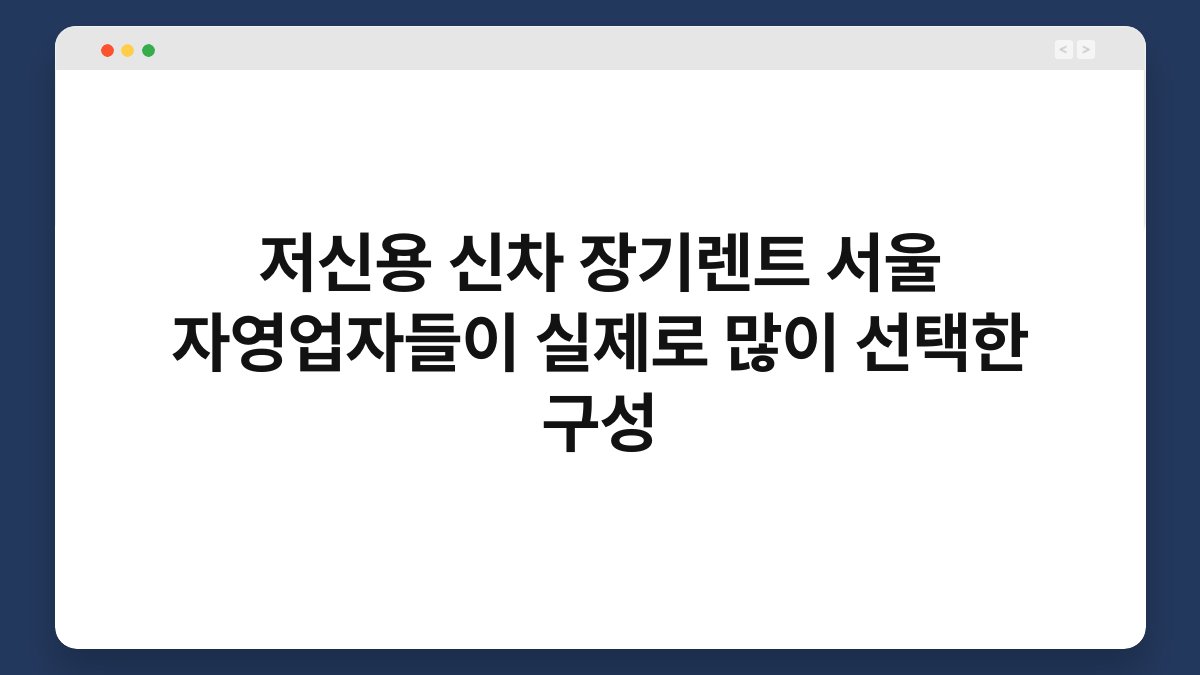 신차를 구매할 때 저신용으로 인해 고민하는 분들이 많습니다. 특히 서울에서 자영업을 하시는 분들은 더욱 그렇죠. 하지만 이제는 저신용 신차 장기렌트라는 선택지가 있습니다. 이 글에서는 자영업자들이 실제로 많이 선택한 장기렌트 구성과 황제오토플랜의 장점에 대해 알아보겠습니다. 저신용자도 부담 없이 차량을 이용할 수 있는 방법을 함께 살펴보시죠.
