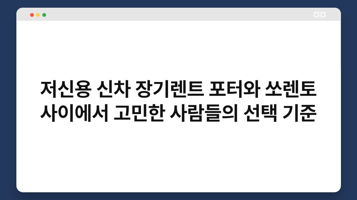 차량 구매를 고민하는 분들이라면 저신용 신차 장기렌트에 대해 들어보셨을 겁니다. 특히 포터와 쏘렌토 같은 인기 차량 사이에서 어떤 선택을 해야 할지 고민하는 분들이 많습니다. 이 글에서는 저신용 신차 장기렌트를 고려할 때, 어떤 기준으로 차량을 선택해야 하는지에 대해 알아보겠습니다. 황제오토플랜의 다양한 서비스와 함께 차량 선택의 팁을 제공하니, 끝까지 읽어보세요.