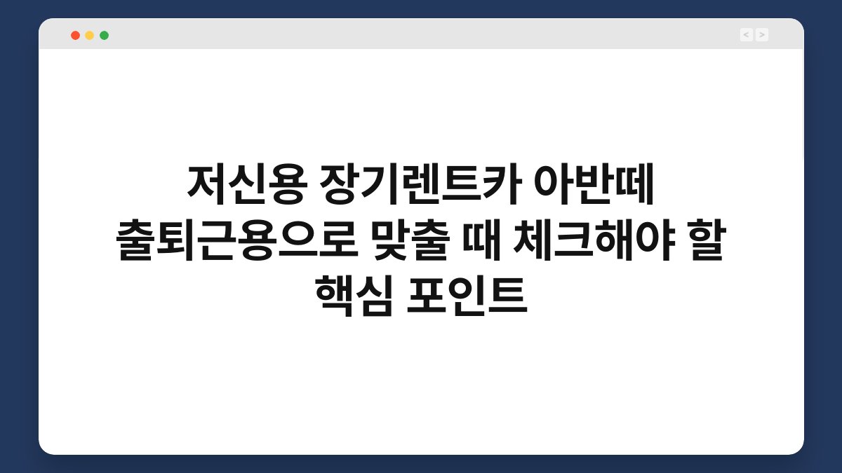 출퇴근에 필요한 차량을 찾고 계신가요? 저신용자도 장기렌트카를 통해 아반떼를 이용할 수 있는 기회가 있습니다. 하지만 어떤 점을 체크해야 할까요? 이 글에서는 저신용 장기렌트카 아반떼를 출퇴근용으로 선택할 때 고려해야 할 핵심 포인트를 소개합니다. 황제오토플랜과 함께라면 더욱 유리한 조건으로 차량을 이용하실 수 있습니다.