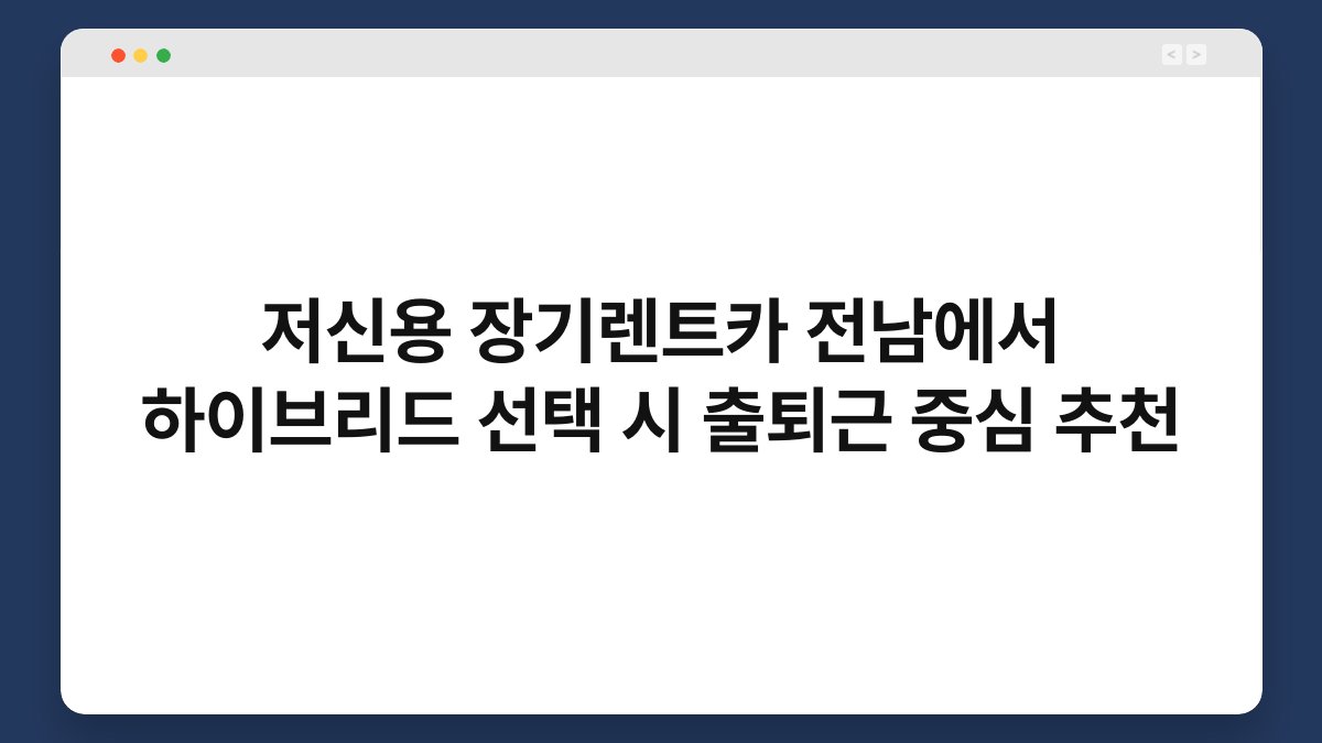 전남에서 저신용으로 장기렌트카를 찾고 계신가요? 특히 출퇴근을 위해 하이브리드 차량을 고려하고 있다면, 이 글에서 유용한 정보를 제공해 드리겠습니다. 저신용자도 부담 없이 이용할 수 있는 장기렌트카 옵션과 함께, 황제오토플랜의 다양한 혜택을 소개할 예정입니다. 하이브리드 차량의 장점과 저신용 장기렌트의 조건을 함께 살펴보며, 출퇴근의 편리함을 만끽할 수 있는 방법을 알아보세요.