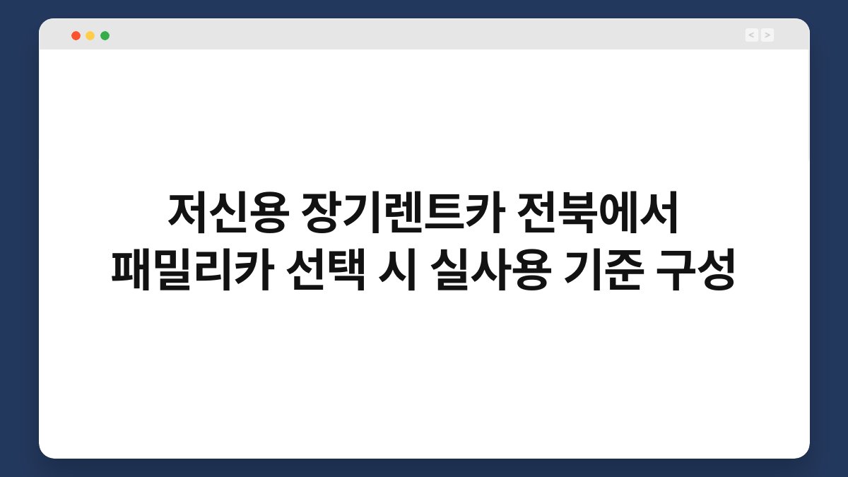 장기렌트카를 고려할 때, 저신용자에게는 선택의 폭이 좁아지는 경우가 많습니다. 특히 전북 지역에서 패밀리카를 선택할 때는 더욱더 신중해야 하죠. 하지만 걱정하지 마세요! 황제오토플랜은 저신용 장기렌트카를 통해 가족 모두가 편안하게 이동할 수 있는 기회를 제공합니다. 이 글에서는 저신용 장기렌트카를 전북에서 선택할 때 고려해야 할 실사용 기준을 함께 살펴보겠습니다.