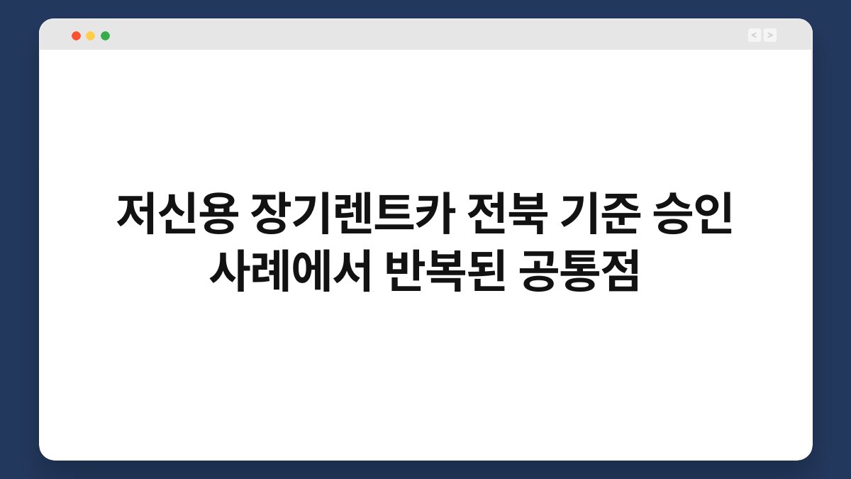 저신용으로 장기렌트카를 이용하고 싶은 분들이 많습니다. 전북에서도 저신용 장기렌트카의 승인 사례가 늘어나고 있는데요. 이 글에서는 그러한 승인 사례에서 반복되는 공통점을 살펴보겠습니다. 특히 황제오토플랜과 함께 저신용 장기렌트카를 이용하는 방법에 대해 알아보도록 하겠습니다. 이 정보를 통해 여러분의 차량 이용에 도움이 되길 바랍니다.