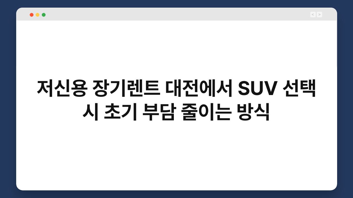 SUV를 선택할 때 저신용으로 고민하는 분들이 많습니다. 특히 대전 지역에서는 초기 비용 부담을 줄이기 위한 다양한 방법이 필요하죠. 저신용 장기렌트는 그런 분들에게 매력적인 옵션이 될 수 있습니다. 황제오토플랜에서는 이러한 문제를 해결하기 위해 최적의 솔루션을 제공합니다. 함께 알아보도록 하겠습니다.
