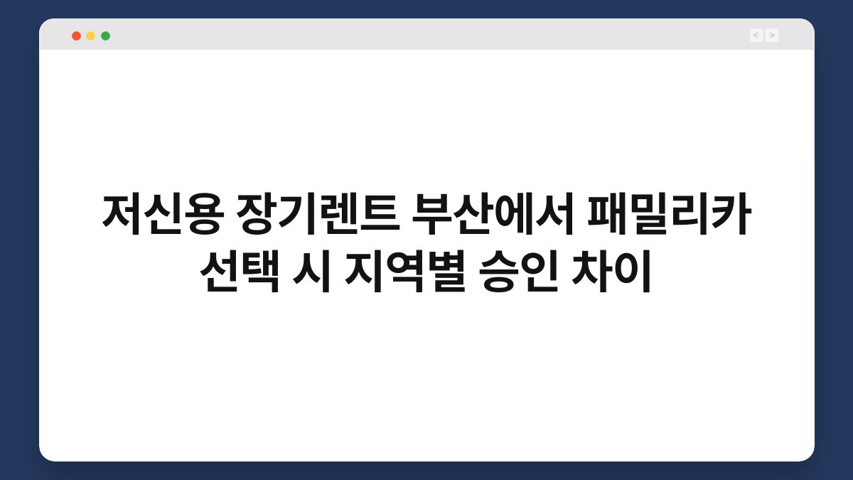 부산에서 저신용으로 장기렌트를 고려하고 계신가요? 패밀리카를 선택할 때 지역별 승인 차이가 있다는 사실, 알고 계셨나요? 많은 분들이 차량 렌트 시 신용 등급을 걱정하지만, 황제오토플랜과 함께라면 그 고민을 덜 수 있습니다. 이 글에서는 저신용 장기렌트와 부산 지역의 승인 차이에 대해 자세히 알아보겠습니다. 차량 선택이 한층 쉬워질 수 있도록 유용한 정보를 제공하겠습니다.