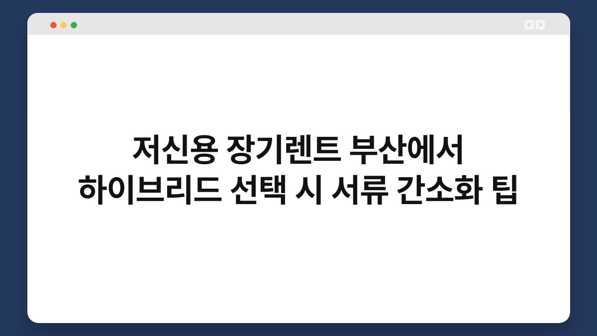 부산에서 저신용으로 하이브리드 장기렌트를 고민하시는 분들이 많습니다. 하지만 서류가 복잡해 포기하는 경우가 적지 않죠. 오늘은 서류 간소화 팁과 함께, 황제오토플랜을 통해 이 과정을 쉽게 해결할 수 있는 방법을 소개해 드리겠습니다. 저신용 장기렌트에 대한 궁금증을 풀어드리며, 하이브리드 차량 선택 시 유용한 정보를 전달할 예정입니다. 끝까지 읽으시면, 꼭 필요한 정보를 찾으실 수 있습니다.