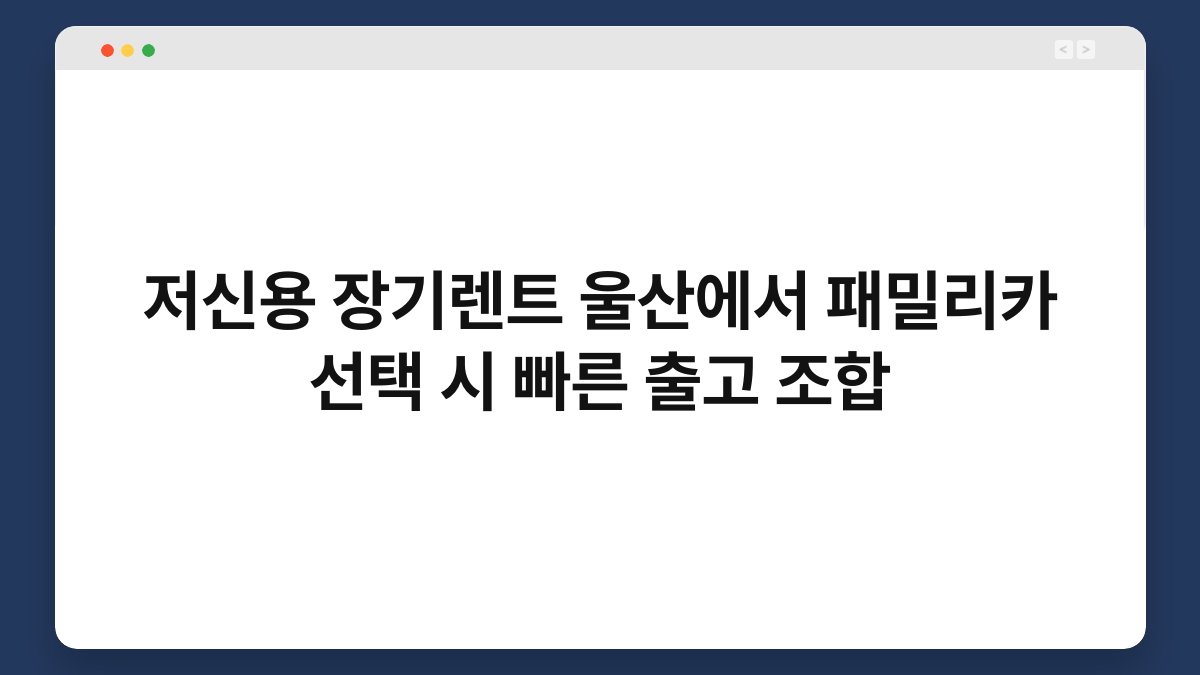 운전할 때 가족과 함께하는 순간, 그 소중함을 느끼는 분들이 많으실 겁니다. 하지만 저신용으로 인해 차량 구매가 어려워 고민이신가요? 울산에서 패밀리카를 선택할 때, 장기렌트는 빠른 출고와 경제성을 동시에 잡을 수 있는 좋은 방법입니다. 황제오토플랜은 이러한 니즈를 충족시켜주는 신뢰할 수 있는 파트너입니다. 이 글에서는 저신용 장기렌트를 통해 패밀리카를 선택할 때 고려해야 할 점과 황제오토플랜의 장점을 자세히 안내해드리겠습니다.