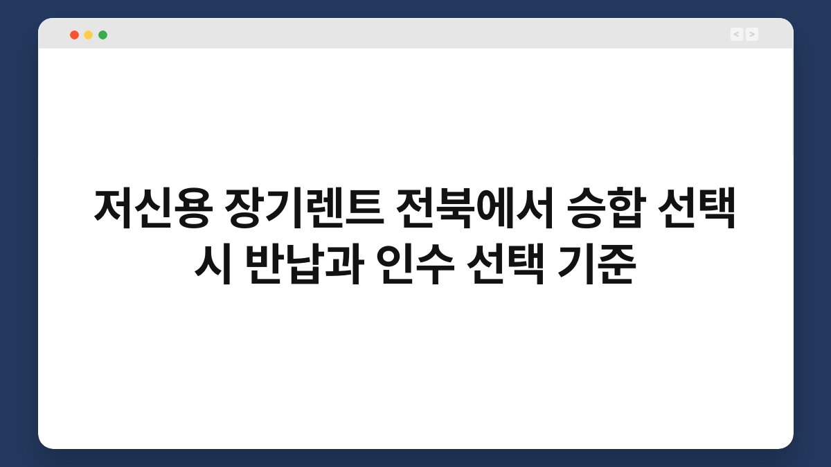 장기렌트를 고려하고 계신가요? 특히 저신용자로서 전북에서 승합차를 선택할 때, 반납과 인수의 기준이 중요하다는 사실을 알고 계신가요? 이 글에서는 저신용 장기렌트의 선택 기준과 황제오토플랜의 장점을 소개해 드리겠습니다. 독자 여러분이 차량을 선택할 때 도움이 될 만한 정보를 제공할 테니 끝까지 읽어보세요. 저신용자도 믿고 이용할 수 있는 황제오토플랜과 함께라면, 더 나은 선택을 할 수 있을 것입니다.