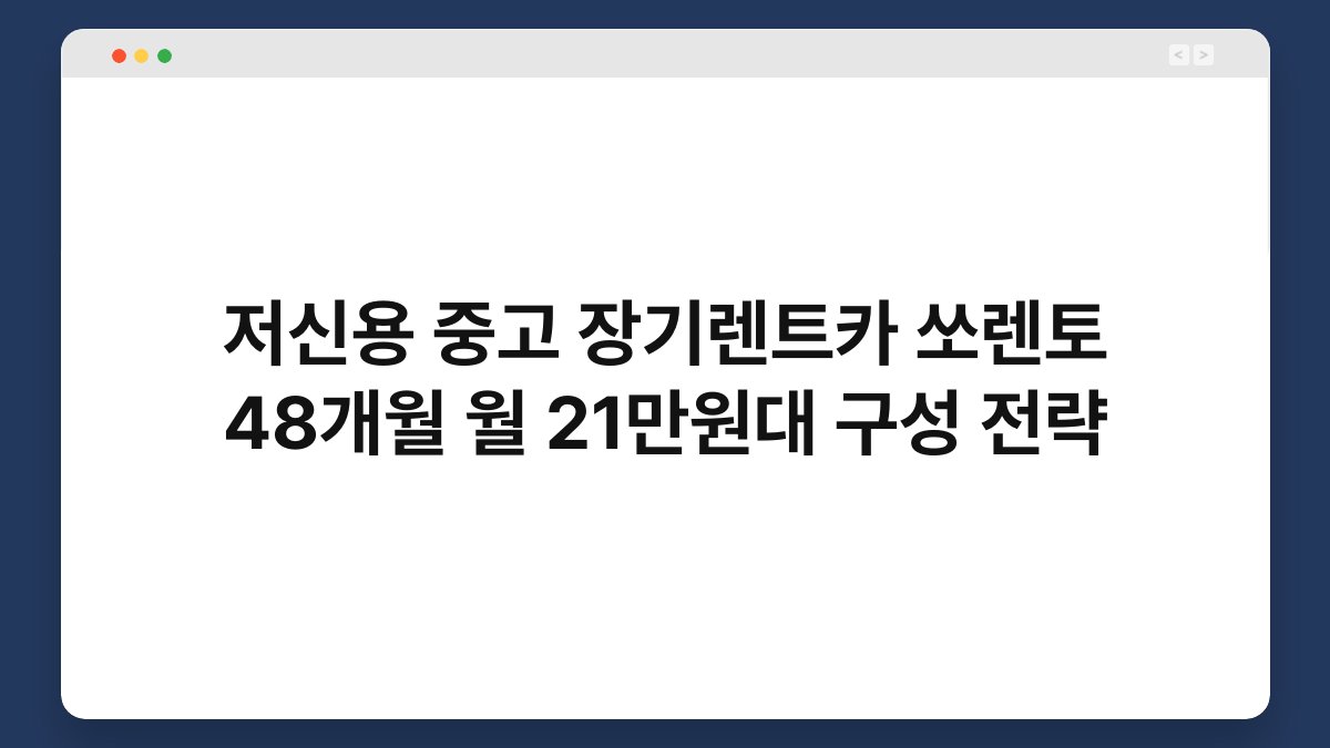 운전할 차량을 찾고 계신가요? 저신용자도 부담 없이 이용할 수 있는 중고 장기렌트카, 특히 쏘렌토를 월 21만원대에 48개월 동안 이용할 수 있는 방법을 소개합니다. 많은 분들이 신용 문제로 차량 구매를 망설이는데, 황제오토플랜을 통해 저신용자도 간편하게 차량을 이용할 수 있습니다. 이 글에서는 저신용 중고 장기렌트카의 구성 전략과 황제오토플랜의 장점을 함께 살펴보겠습니다. 끝까지 읽으시면 유용한 정보가 가득합니다!
