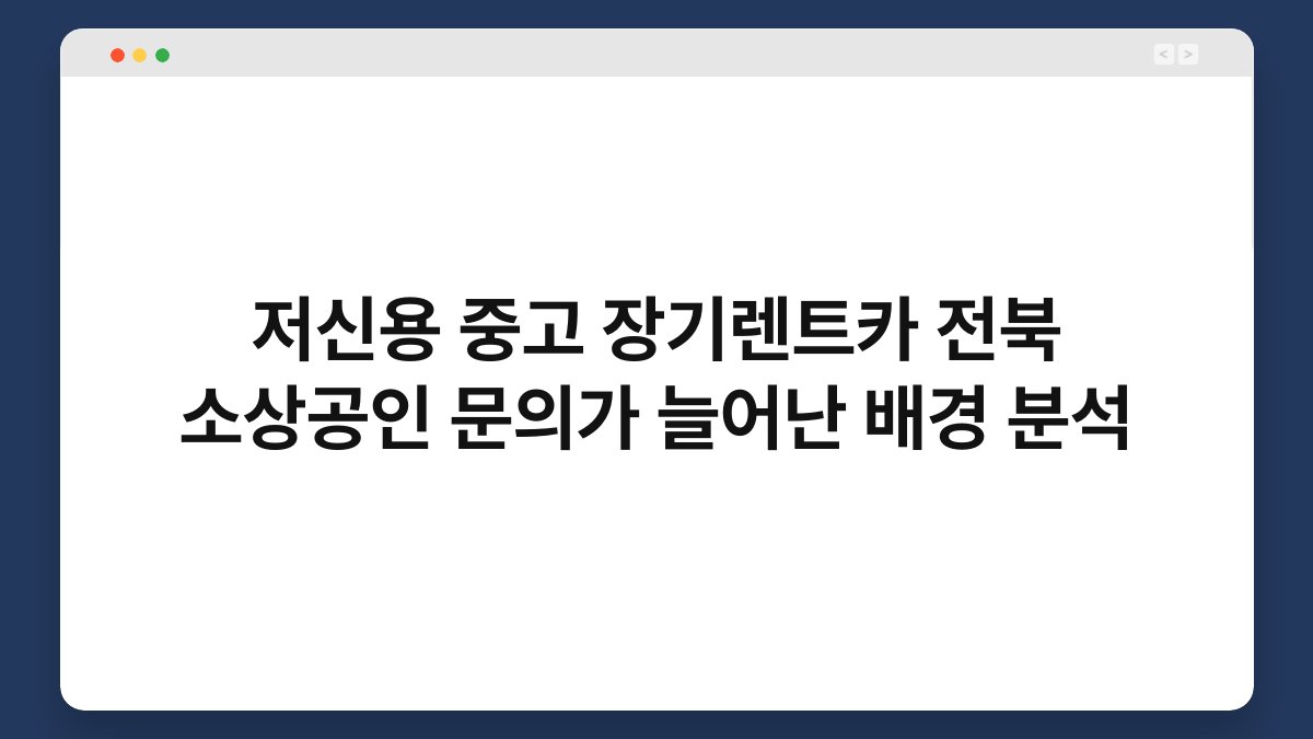 최근 전북 지역의 소상공인들 사이에서 저신용 중고 장기렌트카에 대한 문의가 급증하고 있습니다. 이러한 현상은 단순한 우연이 아닙니다. 경제적 불황과 함께 저신용자들이 차량을 소유하기 어려운 상황에서, 장기렌트카는 실질적인 대안으로 떠오르고 있습니다. 특히 황제오토플랜과 같은 전문 업체를 통해 저신용자들도 부담 없이 차량을 이용할 수 있는 방법이 많아졌습니다. 이 글에서는 이러한 변화의 배경과 장기렌트의 장점을 살펴보겠습니다.