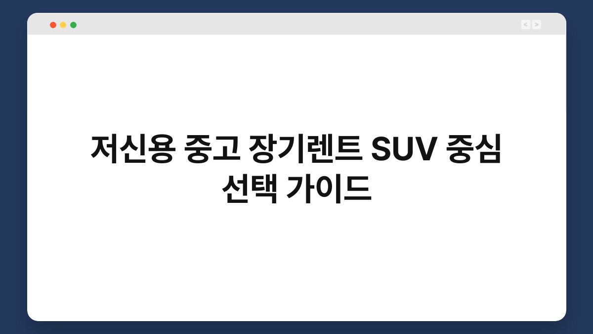저신용자에게 추천할 만한 중고 SUV 모델은 신뢰성이 높은 브랜드의 차량입니다. 예를 들어, 현대나 기아의 SUV 모델은 유지비용이 적고 부품 수급이 용이하여 장기렌트에 적합합니다.