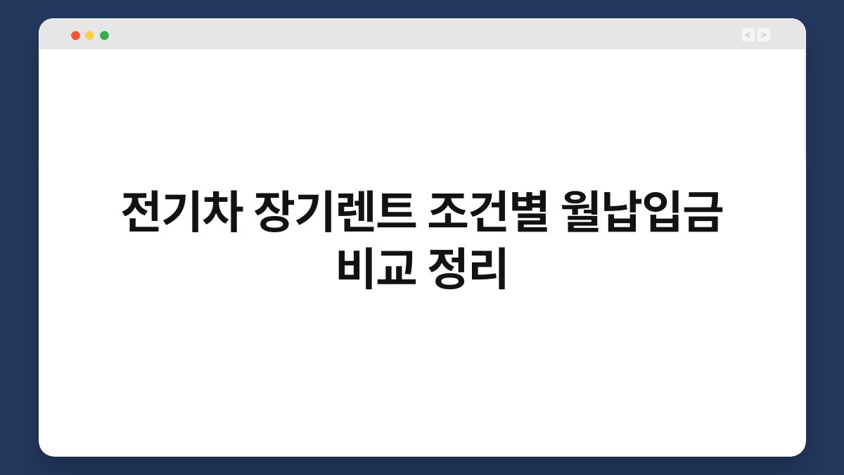 전기차 장기렌트, 요즘 많은 분들이 관심을 갖고 있는 주제입니다. 특히, 조건별 월납입금 비교는 장기렌트를 고려하는 이들에게 매우 중요한 요소죠. 이 글에서는 전기차 장기렌트의 다양한 조건을 살펴보고, 황제오토플랜을 통해 얻을 수 있는 혜택을 소개하겠습니다. 전기차의 매력을 느끼고 싶다면, 이 글을 통해 필요한 정보를 쏙쏙 챙겨보세요.