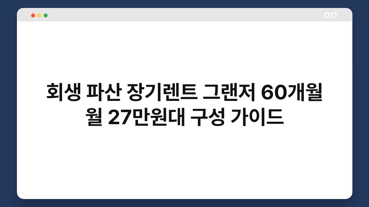 차량을 소유하는 것은 많은 사람들에게 큰 부담이 될 수 있습니다. 특히, 장기렌트는 차량 구매 대신 부담을 줄여주는 좋은 방법이죠. 이번 글에서는 회생과 파산을 고려해야 하는 분들을 위해 장기렌트의 장점을 소개하고, 그랜저를 60개월 동안 월 27만원대에 이용하는 방법을 안내해 드릴게요. 황제오토플랜과 함께하면 더욱 편리하고 유익한 차량 이용이 가능하답니다.