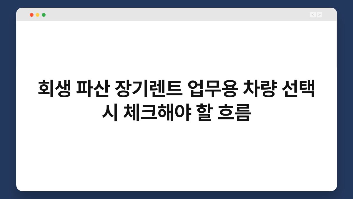 비즈니스에서 차량은 필수적입니다. 하지만 회생이나 파산 상황에서 업무용 차량을 선택하는 것은 쉽지 않은 결정입니다. 장기렌트는 이럴 때 유용한 대안이 될 수 있습니다. 특히 황제오토플랜은 저신용자도 편리하게 이용할 수 있는 다양한 옵션을 제공합니다. 이번 글에서는 회생, 파산, 장기렌트와 관련된 체크리스트를 통해 여러분의 선택을 돕겠습니다.