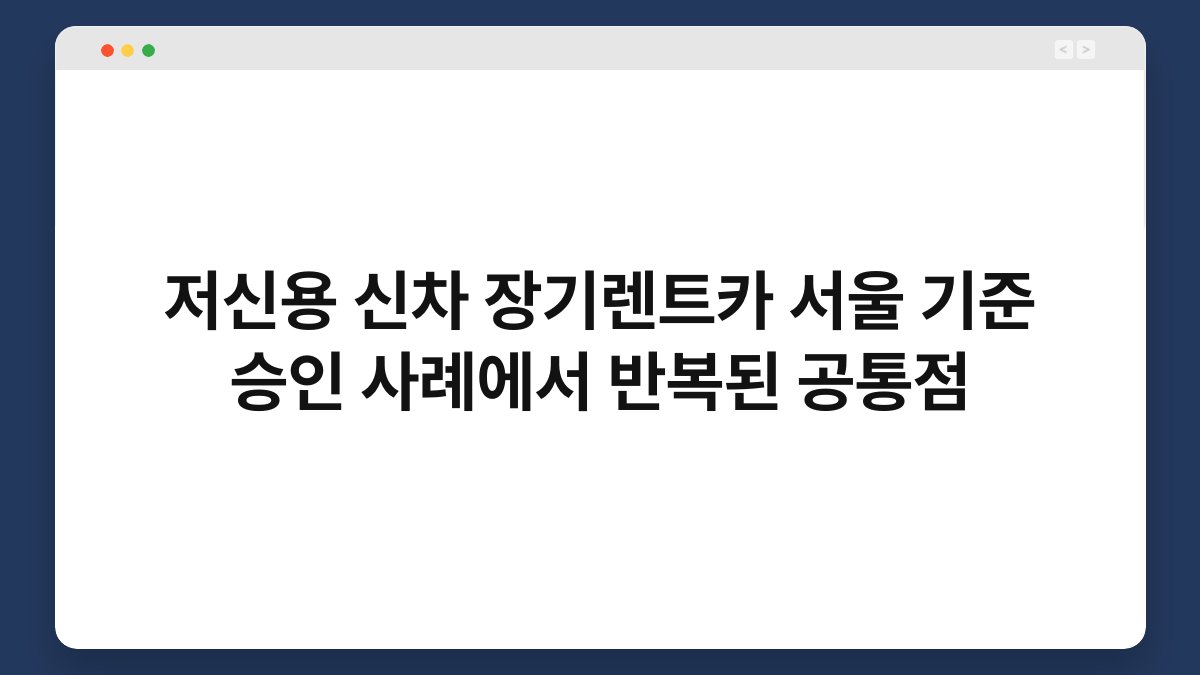 신차를 구매하고 싶지만 저신용으로 인해 고민하고 계신가요? 많은 분들이 신차 구매 시 신용 등급 때문에 어려움을 겪습니다. 특히 서울에서는 이러한 상황이 더욱 두드러지죠. 하지만 저신용 신차 장기렌트카를 활용하면 이런 고민을 덜 수 있습니다. 황제오토플랜은 저신용자도 쉽게 차량을 이용할 수 있는 다양한 옵션을 제공하여 많은 분들에게 긍정적인 결과를 안겨주고 있습니다. 이 글에서는 서울 기준의 승인 사례에서 반복된 공통점을 살펴보며, 저신용 신차 장기렌트카의 장점을 알아보겠습니다.